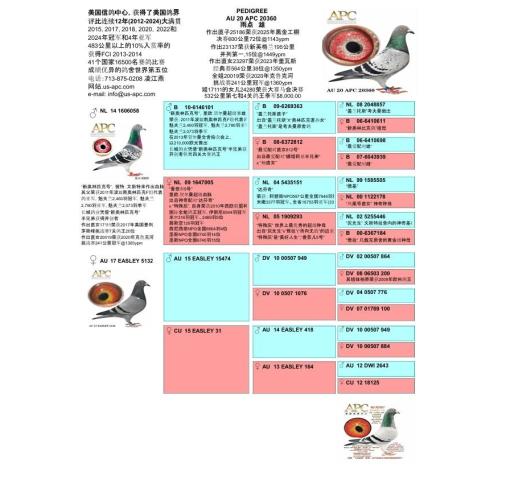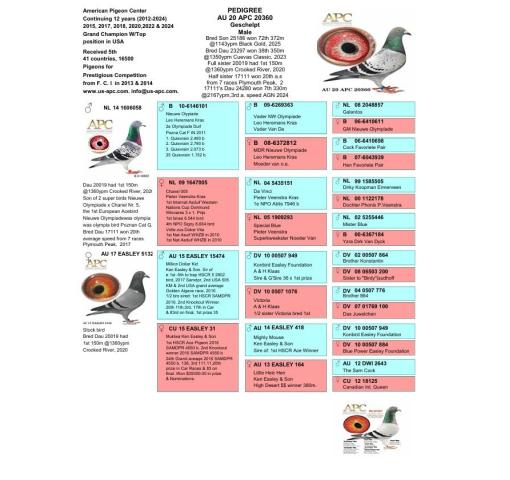 SIRE: NL14 1606058 - Dau 20019 had 1st 150m @1360ypm Crooked River, 2020 Son of 2 super birds Nieuwe Olympiade x Chanel Nr. 5, the 1st European Acebird Nieuwe Olympiadewas olympia was olympia bird Poznan Cat G. Bred Dau 17111 won 20th average speed from 7 races Plymouth Peak, 2017.