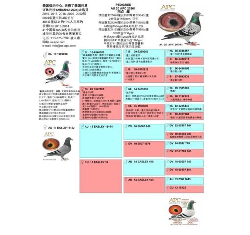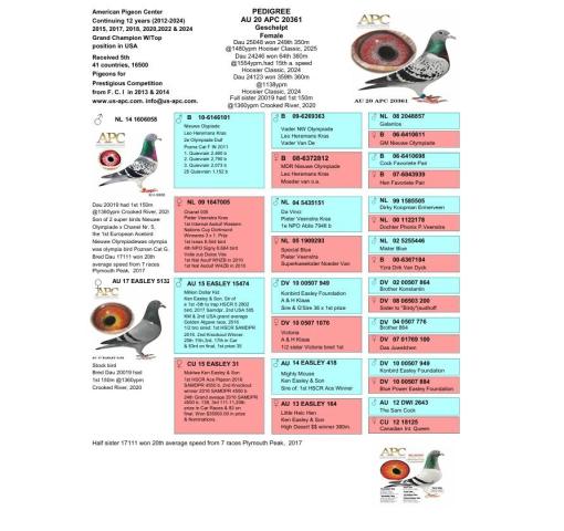 SIRE: NL14 1606058 - Dau 20019 had 1st 150m @1360ypm Crooked River, 2020 Son of 2 super birds Nieuwe Olympiade x Chanel Nr. 5, the 1st European Acebird Nieuwe Olympiadewas olympia was olympia bird Poznan Cat G. Bred Dau 17111 won 20th average speed from 7 races Plymouth Peak, 2017.
