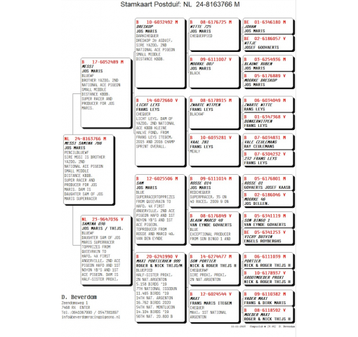 DAUGHTER SAM OF JOS MARIS SUPERRACER TOPPRIZES FROM QUIEVRAIN TO HAFO, 4X FIRST ANGERVILLE, 2ND ACE PIGEON HAFO AND 1ST NOYON YB'S AND 1ST ACE PIGEON. DAM IS HALF-SISTER PROXI,