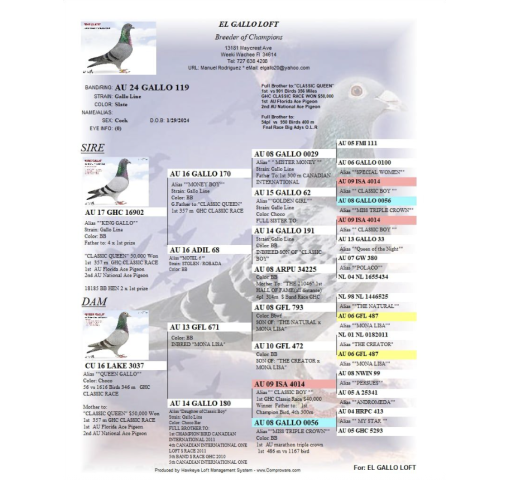 Full brother to 'Classic Queen' - 1st vs 901 birds 356 miles GHC Classic Race won $50,000. 1st AU Florida Ace Pigeon 2nd National Ace Pigeon.  Full brother to 54th place vs 950 pigeons 400 miles Final Race Big Andys OLR