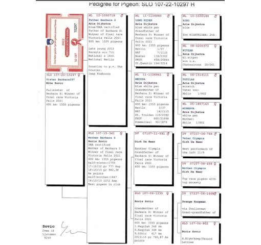 Mother of Barbara S Winner of final race Victoria Falls 2021 600 km: 1555 pigeons half-sister:1759 17:12/12 pr 777 Asp 18:13/13 pr 982,38 As points half-brother: 1847 18:13/13 1072 Asp Best pigeon in club