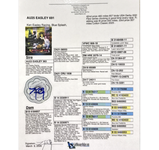 Sire of multiple money winners 1st year breeding 2025. Sire of 23rd Prize 357 miles Cotton Classic 2025. Sire of 6th prize 200 miles Cotton Classic 2025. 47th Prize USA Derby 460 miles 857 birds.