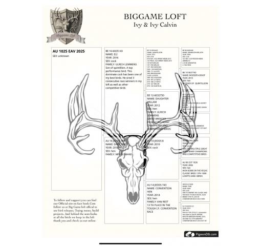 Beautiful bird bred off our main imports. This is the last baby of this specific bloodline. Both the father and mother can be found in many Biggame birds. The sire "Eli" bred by Thorson & daum is a main foundation to many of our early winning birds like "666 Bojack" at California state race. Dam is meulemans bred by Ganus loft. Though her children did not win she is a foundation for 81st 400 mile hoosier. As well as many others here at Biggame loft. This young bird is a cornerstone for our loft and the birds in it.