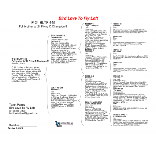 Sire's father from Hebberecht's "Champion" who was 2 Nat. Ace pigeon long distance KBDB 2005, Prov. Ace Pigeon LD and Dam was nestsister to Hebberecht's "Keno," who was the 7. National Ace Pigeon Long Distance KBDB 2016 and 3. Provincial Ace Pigeon Long Distance 2016. Keno is grandson to Ike, half brother of Jaws who sold for 250.000 euros!