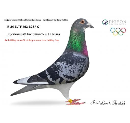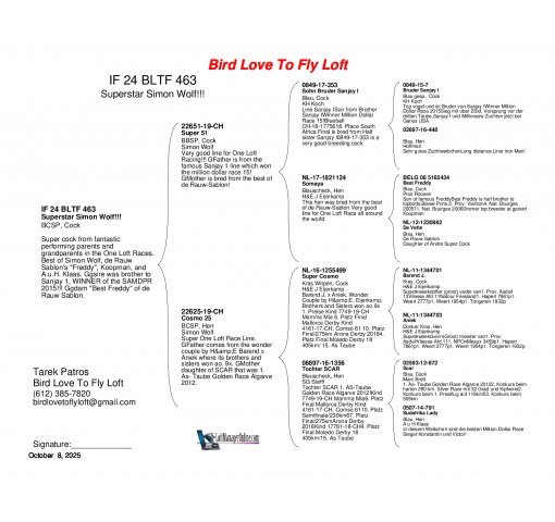 Dam: "Super Cosmo" x "SCAR" bloodlines which have won 9x 1st and many One Loft Race TOP positions.  SCAR was 1st Ace Pigeon Golden Algave 2012!