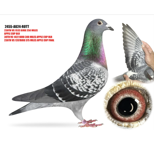 Half-brother of places 1 and 5, both money winners, first drop of the 469 miles at BIG ANDYS OLR, also half-brother of 29 AVE SPEED DE FLORIDA PIGEON DERBY, grandson of my main breeder (931-AU18-GREEK), his pedigree carries blood from SEVEN and PICASSO