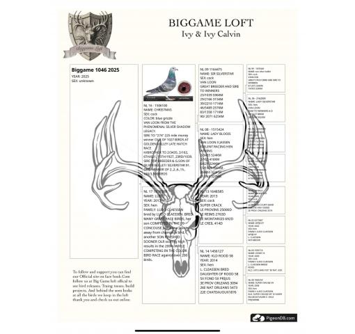 A miss banded bird bred here at Biggame loft. Sire is van loon from the silver shadow series. Sire to 225 mile winner of golden valley OLR. Dam is bred by LUDO claussen a powerful breeder in Europe brought here to improve our grizzle's.