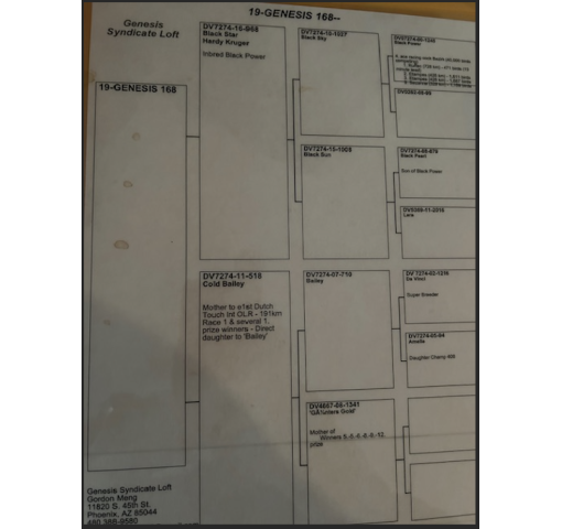 19 Genesis 168  DC Cock   Very nice Hardy Kruger linebred Black Power cock bred by Gordin Meng of Genesis loft. To many cocks to bred and this one deserves a chance in another loft. Medium size, well muscle and strong back.  512-413-5962 for additional info