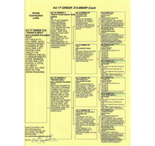 NOT MUCH TO SAY HERE, BOTH PARENTS MONEY WINNERS IN 350 MILE ONE LOFT RACES!! HOW ABOUT THE PARENTS AND ALL 4 GRANDPARENTS WERE WINNERS IN BIG ONE LOFT RACES. A TOTAL OF ABOUT $73,000. ALL OUR BEST IN THIS BIRDS PEDIGREE.