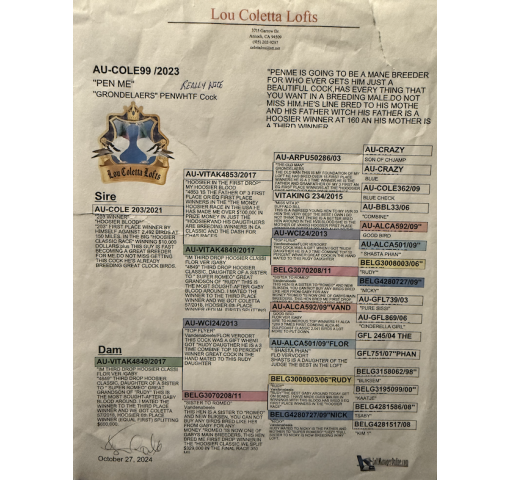"PENME IS GOING TO BE A MANE BREEDER FOR WHO EVER GETS HIM JUST A BEAUTIFUL COCK,HAS EVERY THING THAT YOU WANT IN A BREEDING MALE.DO NOT MISS HIM.HE'S LINE BRED TO HIS MOTHE AND HIS FATHER WITCH HIS FATHER IS A HOOSIER WINNER AT 160 AN HIS MOTHER IS A THIRD WINNER