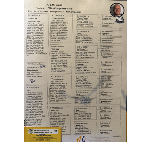 Sohn d. "Prince Porsche" 29rotopen 5230 0 4e nat.Z. Limoges 1129 P. Vater von 10e nat ACE KBDB LD YL 2020.lst ein Volibruder "Porsche 911" 5e nat ACE KBDB GMD in 2015.7e nat. Chateauroux 25.617 Pig. 11e nat. Bourg- 21.484 Pig.Vollbruder zu Boxter 2 x 1e prov. & 8€ nat ACE KBDB LD 2015. 11e nat. Brive 9049 Pig. "Prince Porsche" Vater zu 10e nat.ACE K8DB LD YL 2020.Mutter "ACE 169" w. 2. best YL Fond 2017 bei 3 Fügen.Wird 13e nat.ACE KBDB LD