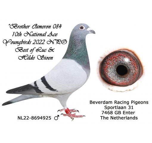 Brother Cameron 084 - 10th National Ace YBs 2022 NPO. Brother Cameron 084, 10th National Ace NPO WHZB Youngbird, 2022 YB. 13th best of the best YB Competition 2022. Tongeren 9/1970, Bierges 53/9227, Weert 115/12831, Nanteuil 9/562.