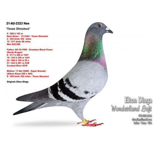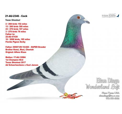 Father: 21-AU-2346 - Texas Shootout (Grandson of Black Power x 1st Champion Bird - Texas Shootout 2017, Ad Schaerlaeckens)
