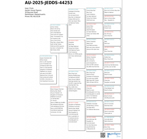 Bred in the UK by Kevin Zerafa who won a few National races and ran a pigeon Stud. Purchased in his full clearance sale Sire is from Ernie's Blue Star x Queen Mary both Ist Nat Tarbes 2018 and 2019 respectiv ely Dam is Chantell 3rd Nat Tarbes 2018