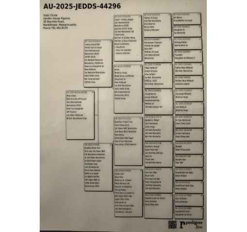 Sire is a son off LLoyd 1st International Barcelona 2018 Dam is a daughter off Triple 2 1st Open National British Barcelona Club