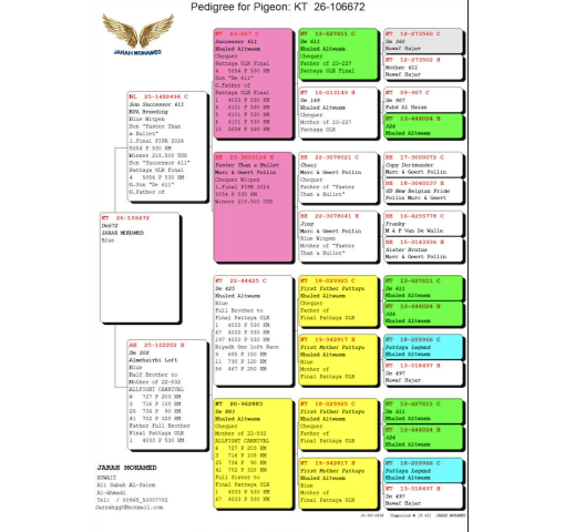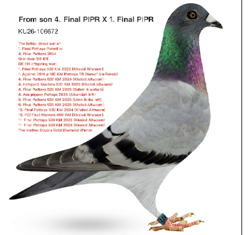 Bred from a full brother to 'Gold Diamond Winner' 1st Final Pattaya OLR 4033 pigeons 530km! Also full sibling to 67th vs 4033 pigeons 530km.
