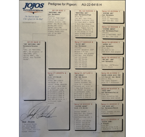 Son of National Leo! Sire to The Boss - 1st Prize Winner Cuevas Classic 2022 350 miles 961 pigeons peed 1315ypm. Sire to 98th Florida Pigeon Derby. One of my best breeders.