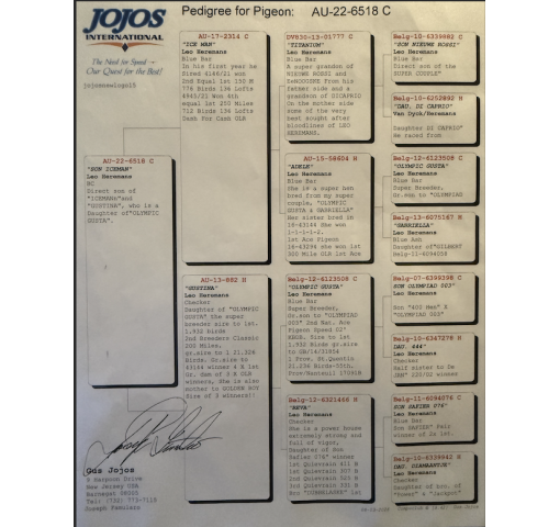 Daughter of Olympic Gusta, the super breeder for Gus Jojos Loft!