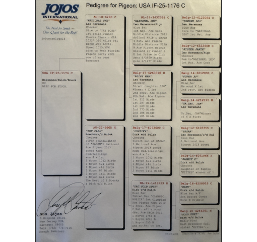Sire to THE BOSS 1st Prize Winner Cuevas Classic OLR 2022 350 miles 961 birds, 280 lofts speed 1315ypm.  Sire to 98th Florida Derby 2021. One of my best breeders.