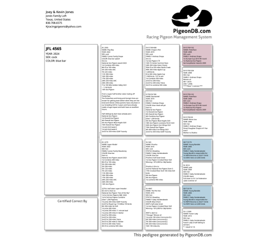 2270 is half sister super breeder: KJ's Girl is Dam to: National Ace Pigeon "Ace of the Sky"