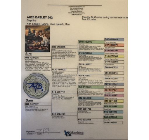 Grandfather 2nd Ace AGN 2025. LDHA AB DED4 CCCC. Offspring of Kittel won 175x 1st place! 10x 1st w 10,000+ pigeons, 1st 18,000 pigeons 1st 17,000 pigeons 1st 16,000 pigeons 1st 14,000 pigeons 1st 10,000 pigeons 1st 10,000 pigeons 1st 8000 pigeons 1st 8000 pigeons.