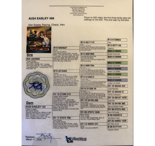 Absolute Stunning hen. Mother of 18th Place 401 miles Cuevas Classic 2023. Grandmother 17th place 401 miles Cuevas 2024. 10th Ace Pigeon Thailand masters 2024.