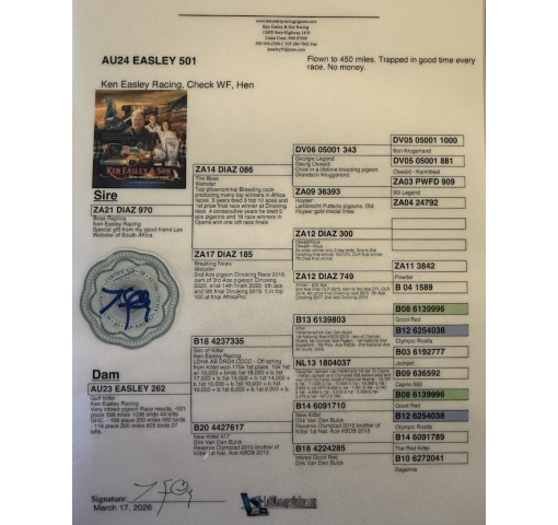 Dam: AU23 EASLEY 262 - Heavy inbred granddaughter of Kittel. Half sister bred 2nd Ace Pigeon AGN 2025!