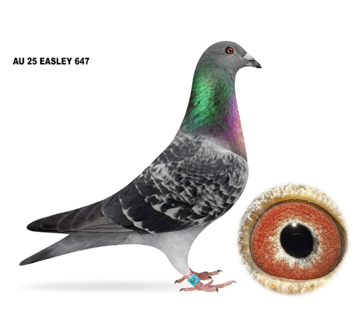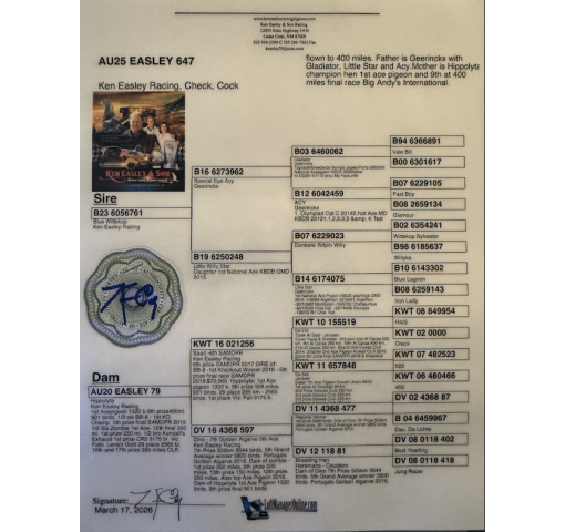 Flown to 400 miles. Father is Geerinckx with Gladiator, Little Star and Acy. Mother is Hippolyta champion hen 1st ace pigeon and 9th at 400 miles final race Big Andys International!