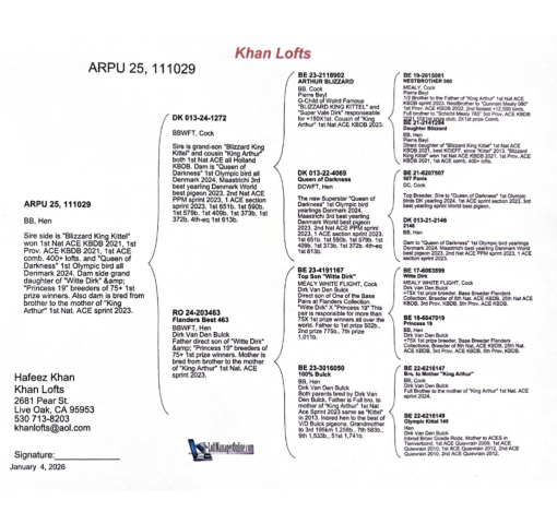 Sire side is "Blizzard King Kittel" won 1st Nat ACE KBDB 2021, 1st Prov. ACE KBDB 2021, 1st ACE comb. 400+ lofts. and "Queen of Darkness" 1st Olympic bird all Denmark 2024. Dam side grand daughter of "Witte Dirk" and "Princess 19" breeders of 75+ 1st prize winners. Also dam is bred from brother to the mother of "King Arthur" 1st Nat. ACE sprint 2023.