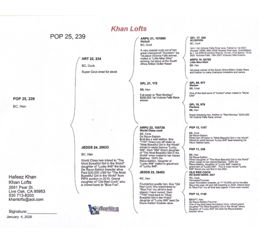 World Class hen inbred to "The Most Bueatiful Girl in the Word* daughter of "Lucky 848" the best De Rauw-Sablon breeder alive. Paid $30,000 USD for "The Most Bueatiful Girl in the World" from PIPA auction in 2010. Grand daughter of "Old Red Cock" who is inbred back to "Blue Fox".