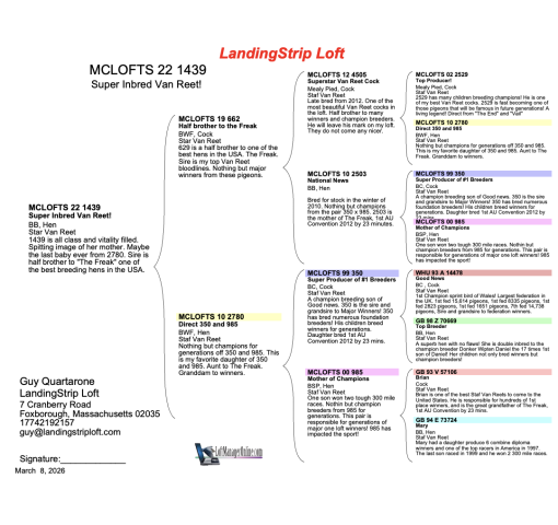 629 is a half brother to one of the best hens in the USA. The Freak. Sire is my top Van Reet bloodlines. Nothing but major winners from these pigeons.