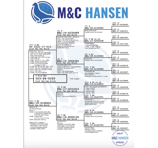 **There is an additional $290 import fee to be added to the price of the pigeon. The pigeons are already with BestPigeons in perfect health, ready to ship!   From the old lines of Dirk Van den Bulck. OLYMPIC ROSITA, GOEDE RODE, BROER GOEDE RODE, KITTEL on the pedigree. Super lines.