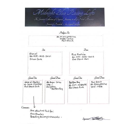 AU 25 Midnightblue 2288 Red Check Cock.  Another super pigeon from the heart of the Janssen Brothers of Arendonk bloodlines.  Proven performance Janssens waiting to be cross onto any family of pigeons.