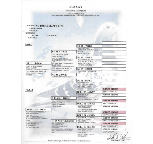 Sire: “Super Saigon” is grandfather to the 1st Place High Desert Yearling Classic 380 mile winner.  He is a grandson of “Miss Saigon” who was the 2nd National Ace Pigeon Short Distance of the Netherlands.