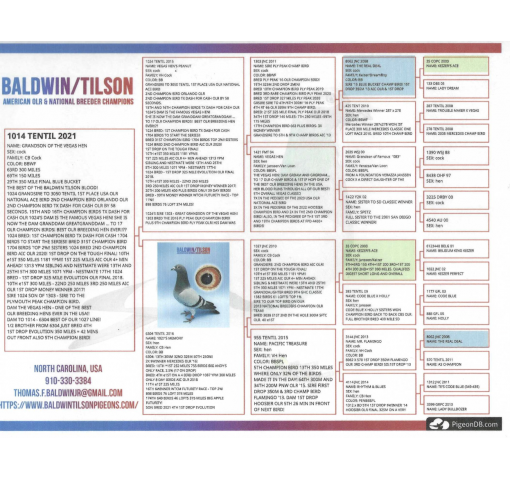 Sire: “Vegas Hen’s Peanut” a son of the famous “Vegas Hen” he is grandsire to 1st National Ace Pigeon National OLR USA, 2nd Champion Bird Orlando OLR, 2nd Champion Bird Texas Dash for Cash