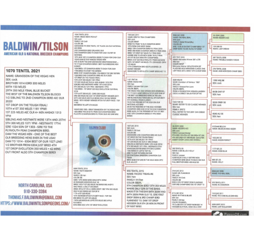 Sire: “Vegas Hen’s Peanut” a son of the famous “Vegas Hen” he is grandsire to 1st National Ace Pigeon National OLR USA, 2nd Champion Bird Orlando OLR, 2nd Champion Bird Texas Dash for Cash