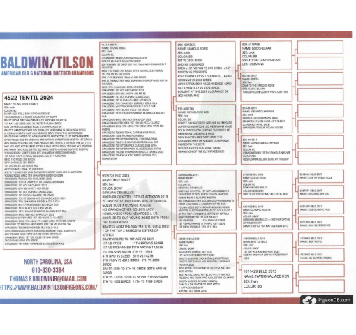 Sire: “Young Rossi” the super breeding son of “Rossi” of Leo Heremans.  He is father and grandfather to an unbelievable record of money winners.  He is father of 2016 BFC Champion Bird winning $20,000.  Checkout the pedigree to see the record, but they have scored big in Hoosier, California Classic, Big Andy’s OLR, Cuevas Classic, Black Gold OLR, Royal Cup, Pattaya.  He is also a grandson of “Nieuwe Olympiad.”
