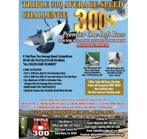 I am a veterinarian.  I have flown birds for 46 years.  First half in Guadalajara Jalisco Mexico.  I have worked in pigeon genetics for many years.  I work with 6 families of birds all based on results.  My birds have proven themselves in 5 countries and 4 continents.  As well as club and one-loft races.  My name is Carlos Abitia and my loft name is Tres Coronas Loft from Santa Maria, CA.  I have also included the flyer for my Triple 300 One Loft Race.