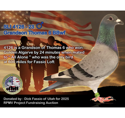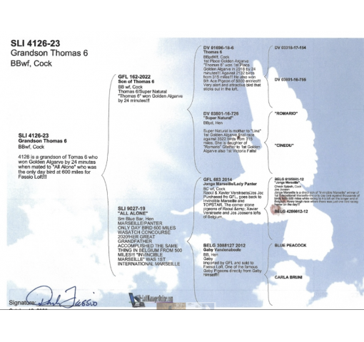 4126 is a grandson of Thomas 6 who won Golden Algarve by 24 minutes when mated to All Alone who was the only day bird at 600 miles for Fassio Loft!