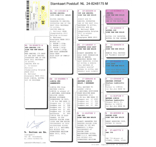 DIRECT DAUGHTER TOP BREEDER KLEINE DIRK FATHER TO 1ST NPO NANTEUIL 5.901p. DESCANDENTS OF KLEINE DIRK HALFBROTHER KITTEL WON 2.2.3. NATIONAL ACE MIDDLE DIS. YOUNGSTERS BELGIUM KBDB 2013, 2014, 2015.