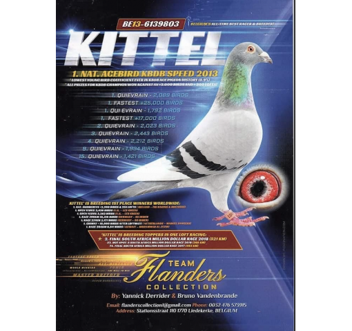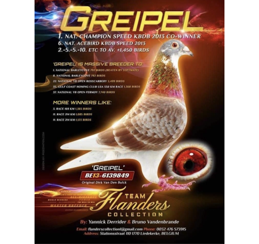 MISTER GREIPEL GRANDSON TO GREIPEL SUPERSTAR ONE OF THE BEST FULL BROTHERS TO KITTEL. GREIPEL WON AO  1. National KBDB championship 2013 Belgium co-winner 6. National Acepigeon KBDB 2013 Winner of: 2. NOYON 1.559p. 5. NOYON 1.371P. 5. NOYON 1.603p. 10. NOYON 1.255p. AND ALSO GRANDSON GOLD DUST  ALSO ALOT OF FAMILY KITTEL.