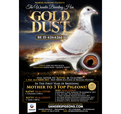 DIRECT DAUGHTER TO GOLD DUST FOUNDATION HEN OF MARCEL SANGSERS MAYBE THE BEST BREEDING SISTER OF KITTEL X KONICA  FULL BROTHER OF "OLYMPIC ROSITA" MOTHER TO KITTEL AND HERSELF ALSO OLYMPIC PIGEONS ALSO MOTHER TO NEW KITTEL AND GREIPEL.