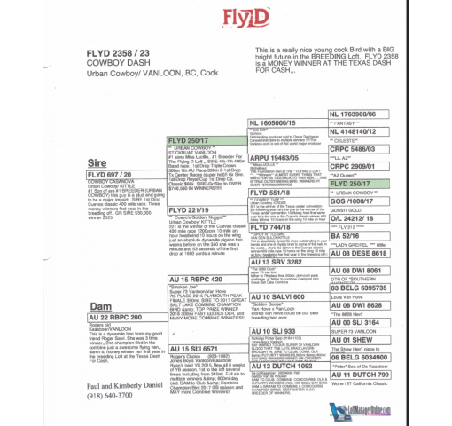 Sire: FLYD 697 / 20 - #1 son of our foundation breeder Urban Cowboy this guy is a stud and going to be a major impact. ire 1st Drop Cuevas 400 miles. Three money winners the first year breeding. Grandsire to $30,000 winner 2023.