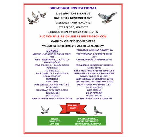 PLEASE NOTE THERE IS GOING TO BE A LIVE AUCTION AFTER THE ONLINE AUCTION ENDS ON BESTPIGEONS!!! ALL ONLINE BIDS WILL BE TAKEN TO THE LIVE AUCTION.