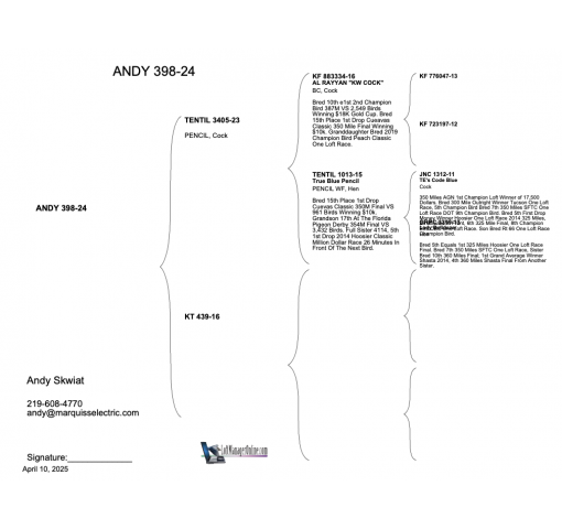 Sire: TENTIL 3405 23 - Son of the top breeder KW Cock mated to a daughter of 1312!